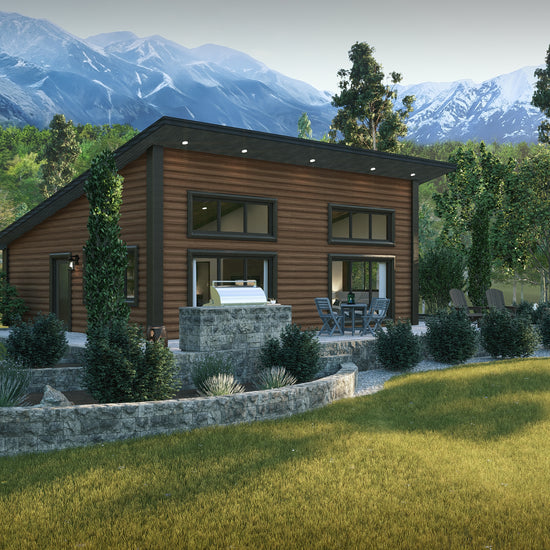 This 864-sq-ft, 1-bedroom, 1-bath log cabin kit combines modern style with classic log-cabin craftsmanship. Featuring a sleek single-slope roof and a dramatic feature wall filled with large windows, our Modern Mountain cabin kit is designed to maximize natural light and deliver a bold, contemporary look—perfect for vacation homes, rental cabins, or compact full-time living.