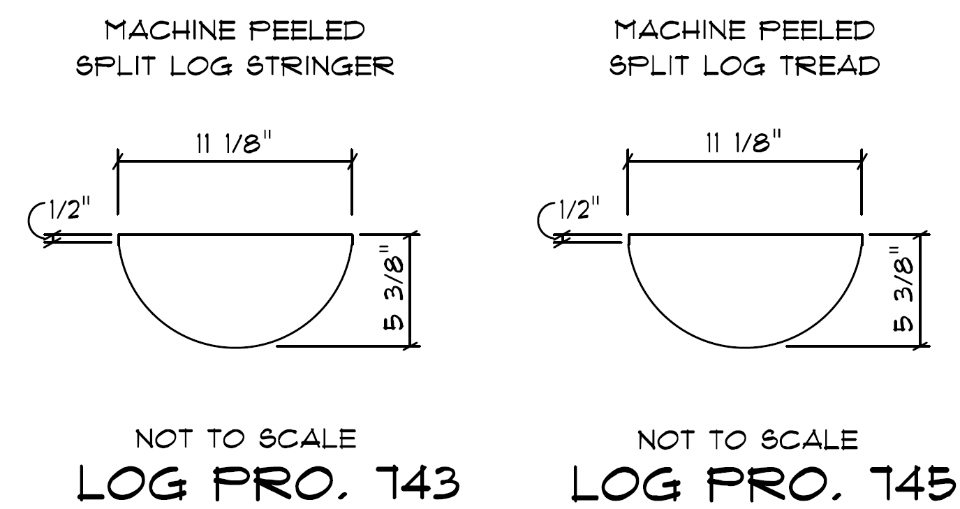 Both the stringers and the tread material measure out at 11 1/8" D x 5 3/8" H (see drawing in photos). Each half log piece also features a 1/8" bevel along the two long edges.
